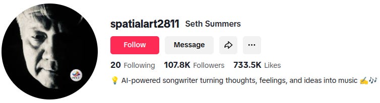 The clip description does not mention anything about #AI. Think for a second. When scrolling through TikTok, how many times do you actually go to the posterâs profile to read the About section? The profile states âAI-powered songwriterâ.