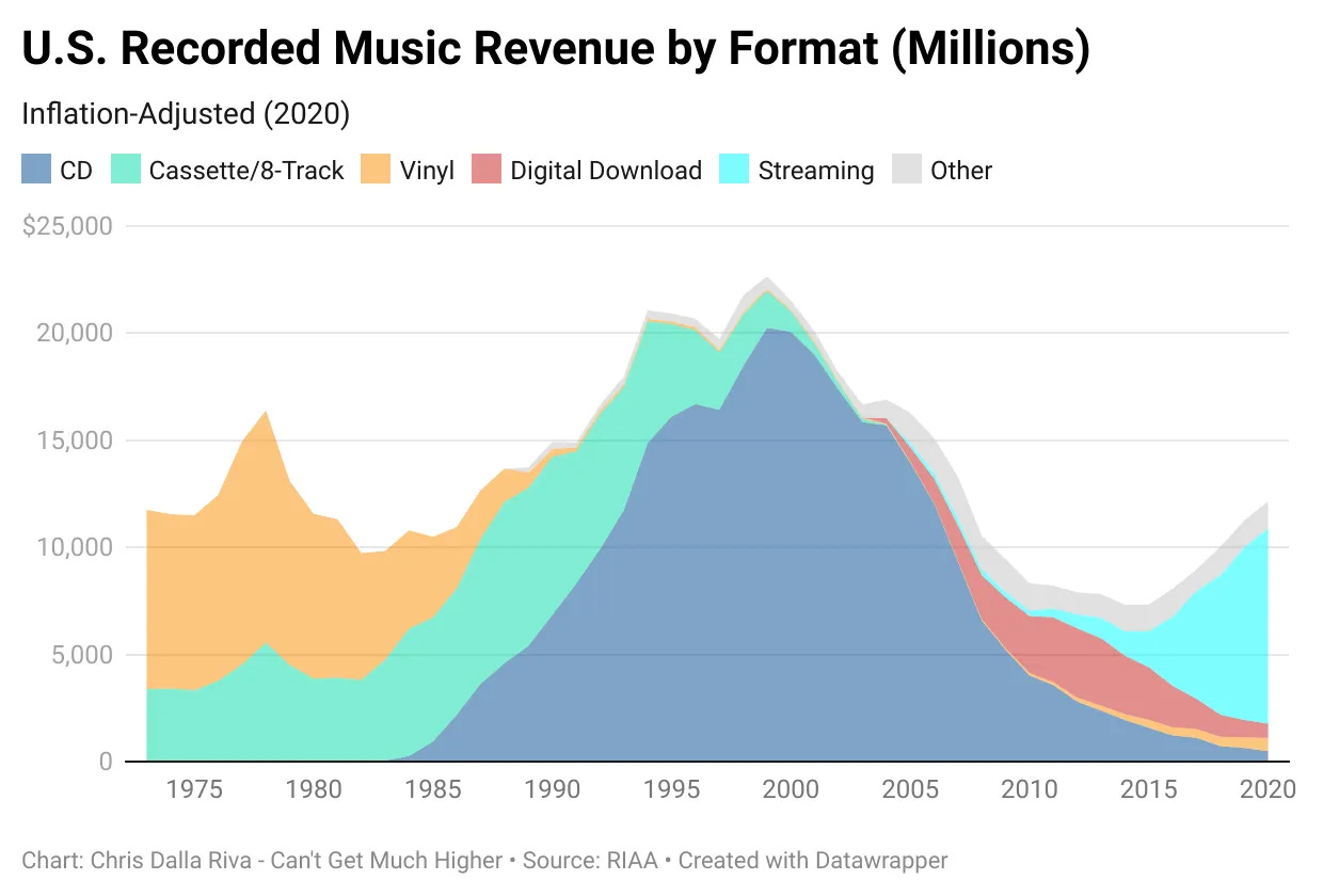 It is probably no surprise that the majority of revenue today comes from streaming for many artists - as physical products have dwindled. (Source: RIAA and Chris Dalla Riva)